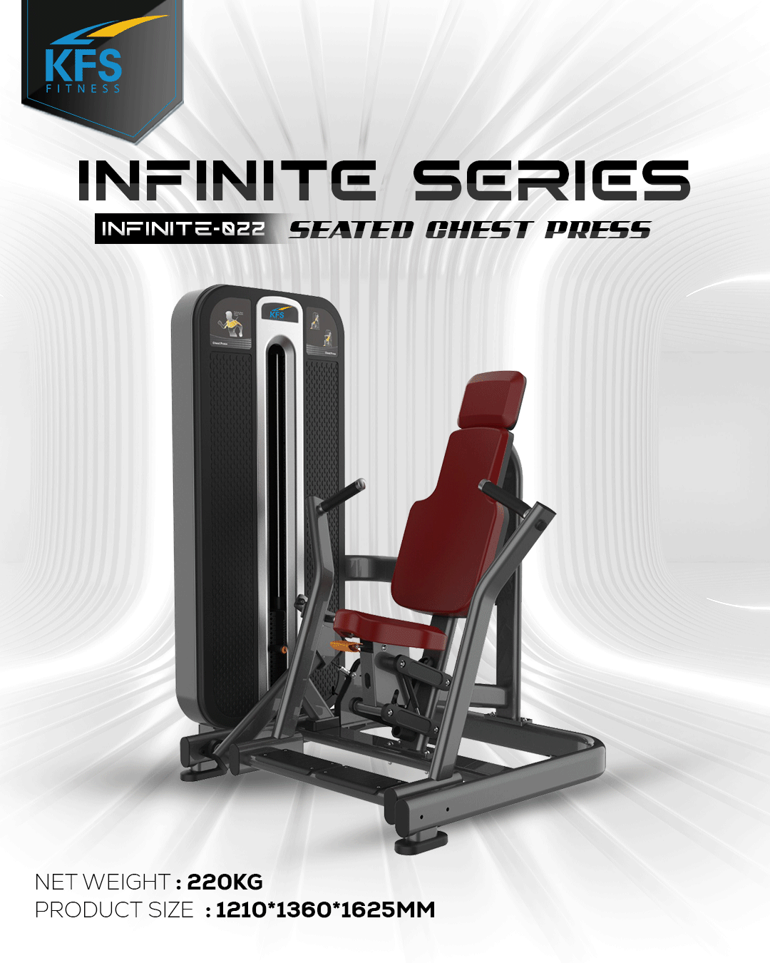 HomeCommercial UseStrength SeriesSelectorizedINFINITE SERIESInfinite Seated Chest Press Infinite Seated Chest Press Controlled chest pressing machine designed for shoulder-safe movement. Category: INFINITE SERIES Product ID: 44567 Description Description Specifications: Target Muscles: Chest, Triceps, Front Delts Weight Stack: 80–100 kg Adjustable seat height Ergonomic press handles Related products Add to WishlistRemove from Wishlist Add to Wishlist Infinite Leg Curl (Seated) Read more Add to WishlistRemove from Wishlist Add to Wishlist Infinite Leg Extension Read more Add to WishlistRemove from Wishlist Add to Wishlist Infinite Leg Press Read more
