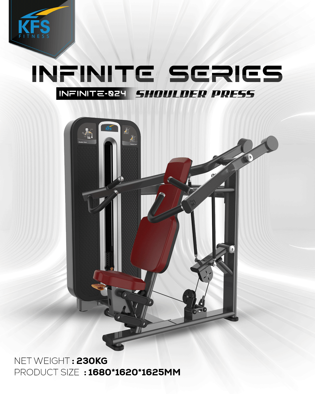 HomeCommercial UseStrength SeriesSelectorizedINFINITE SERIESInfinite Shoulder Press Infinite Shoulder Press Overhead pressing machine built for stable and biomechanically correct motion. Category: INFINITE SERIES Product ID: 44568 Description Description Specifications: Target Muscles: Shoulders, Triceps Weight Stack: 80–100 kg Adjustable seat Smooth vertical press path Related products Add to WishlistRemove from Wishlist Add to Wishlist Infinite Back Extension Read more Add to WishlistRemove from Wishlist Add to Wishlist Infinite Triceps Press Read more Add to WishlistRemove from Wishlist Add to Wishlist Infinite Lat Pulldown / Seated Row Read more
